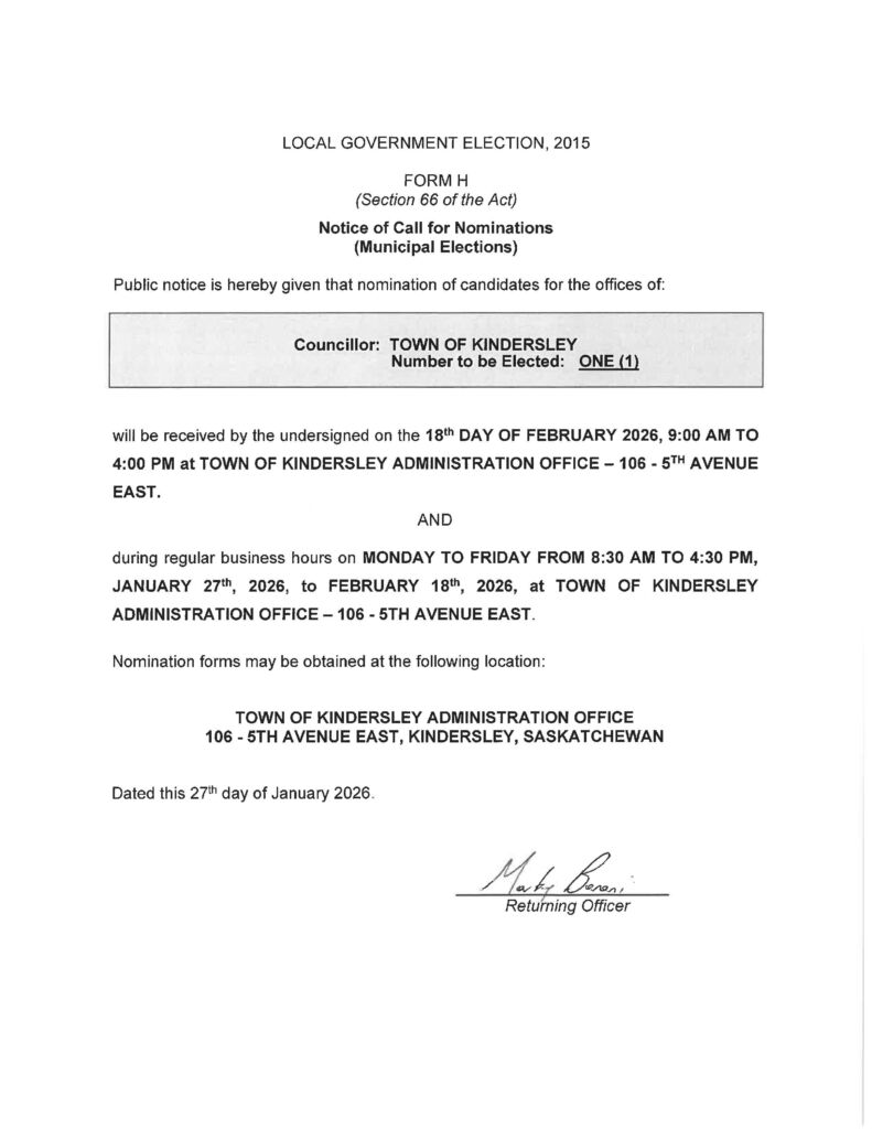 - Election Day – Wednesday, March 25, 2026 from 9:00am to 8:00pm at the Town of Kindersley Administration Office (106 – 5th Avenue East)