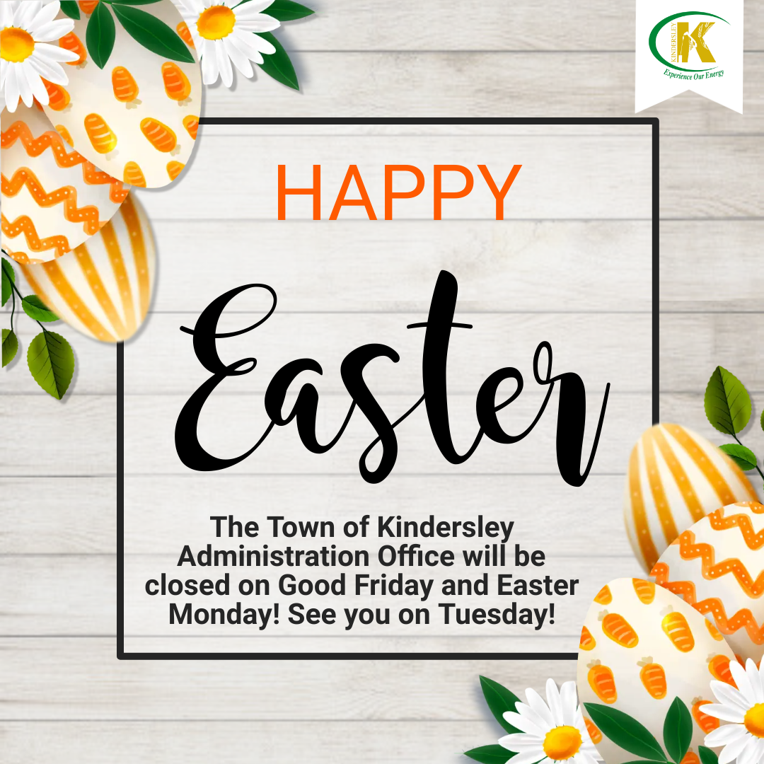 Have a safe and happy Easter! The Town of Kindersley Administration Office will be closed on Good Friday and Easter Monday! See you on Tuesday!