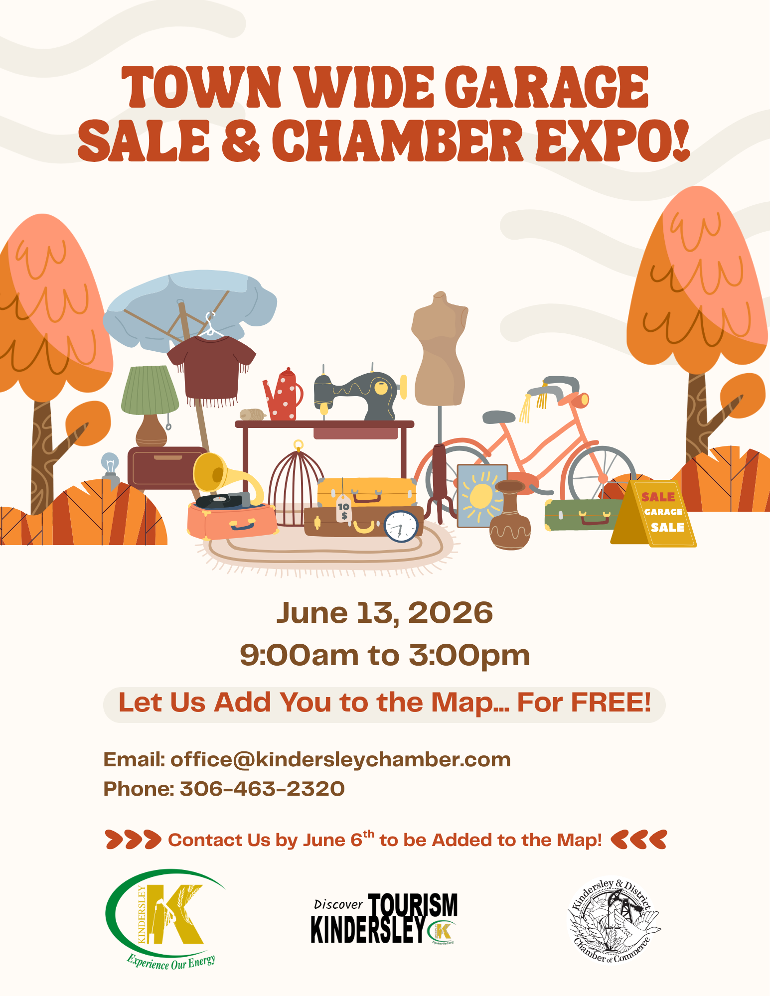 Town Wide Garage Sale & Chamber Expo! Excited to assist the Kindersley Chamber of Commerce with advertising the Town Wide Garage Sale & Chamber Expo! By Communications|2026-04-08T10:13:45-06:00April 8th, 2026|Categories: Community, News and Notices, Recreation and Culture|